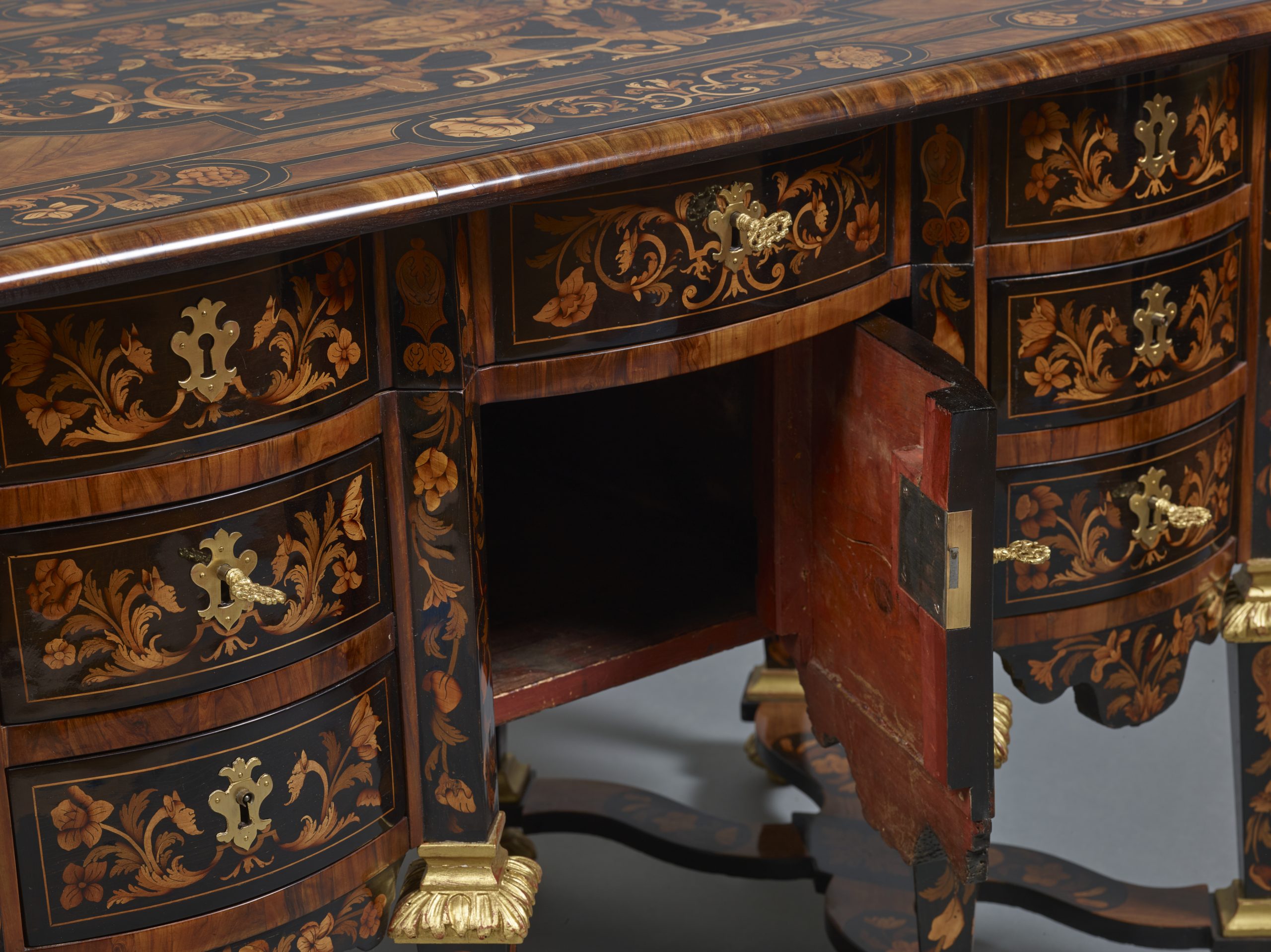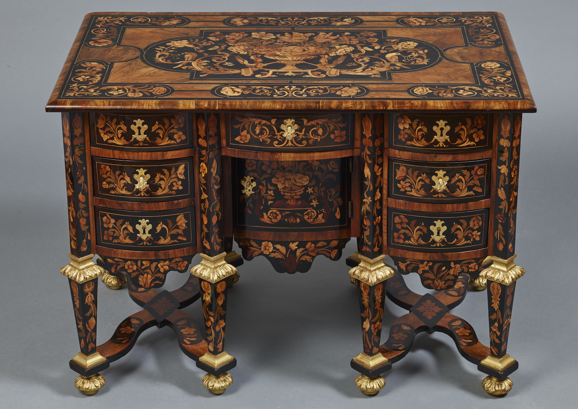 Riche marqueterie de rinceaux, fleurettes, oiseaux, vases fleuris et satyres sur le plateau, la façade, les côtés, les montants et les entretoises.