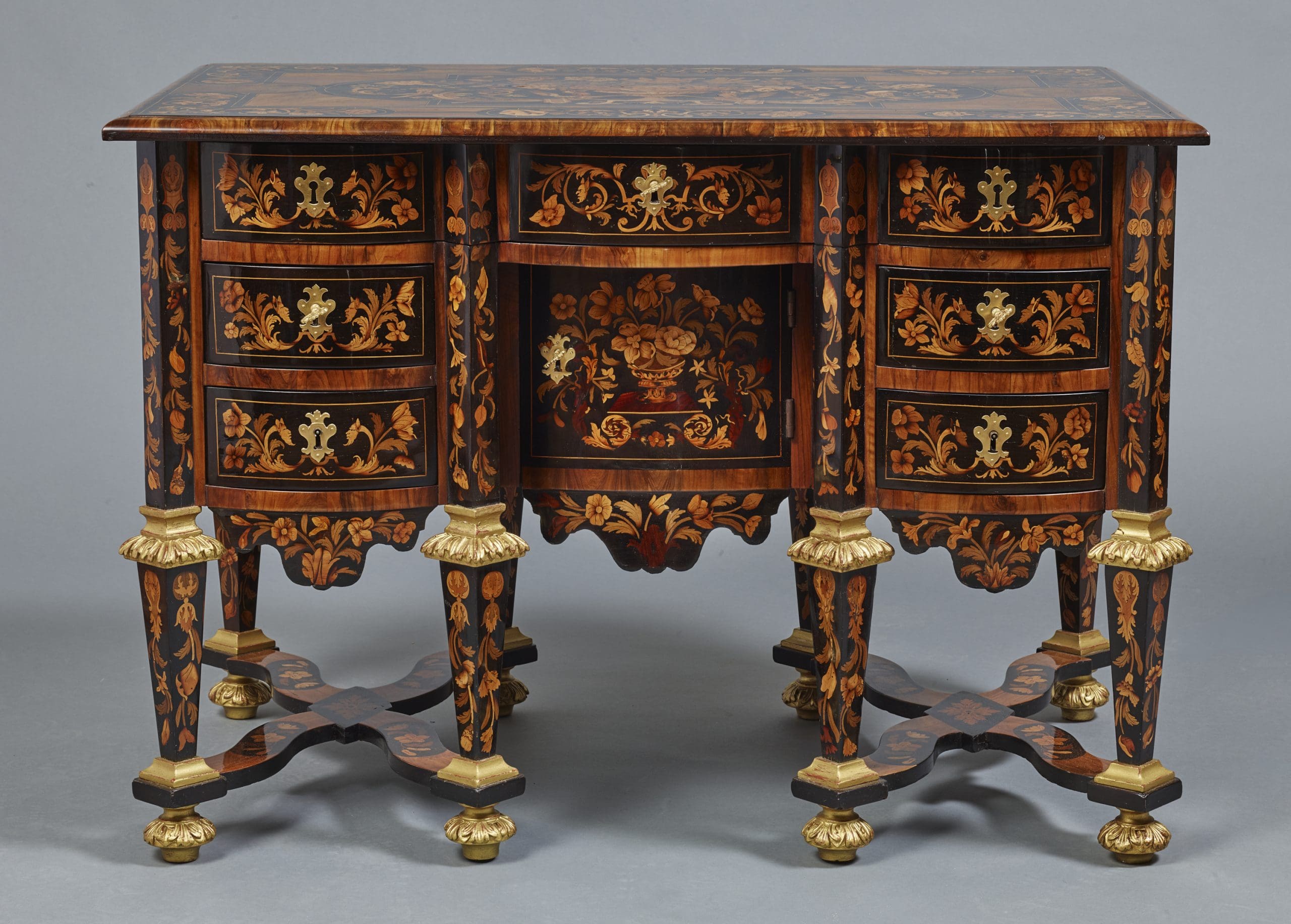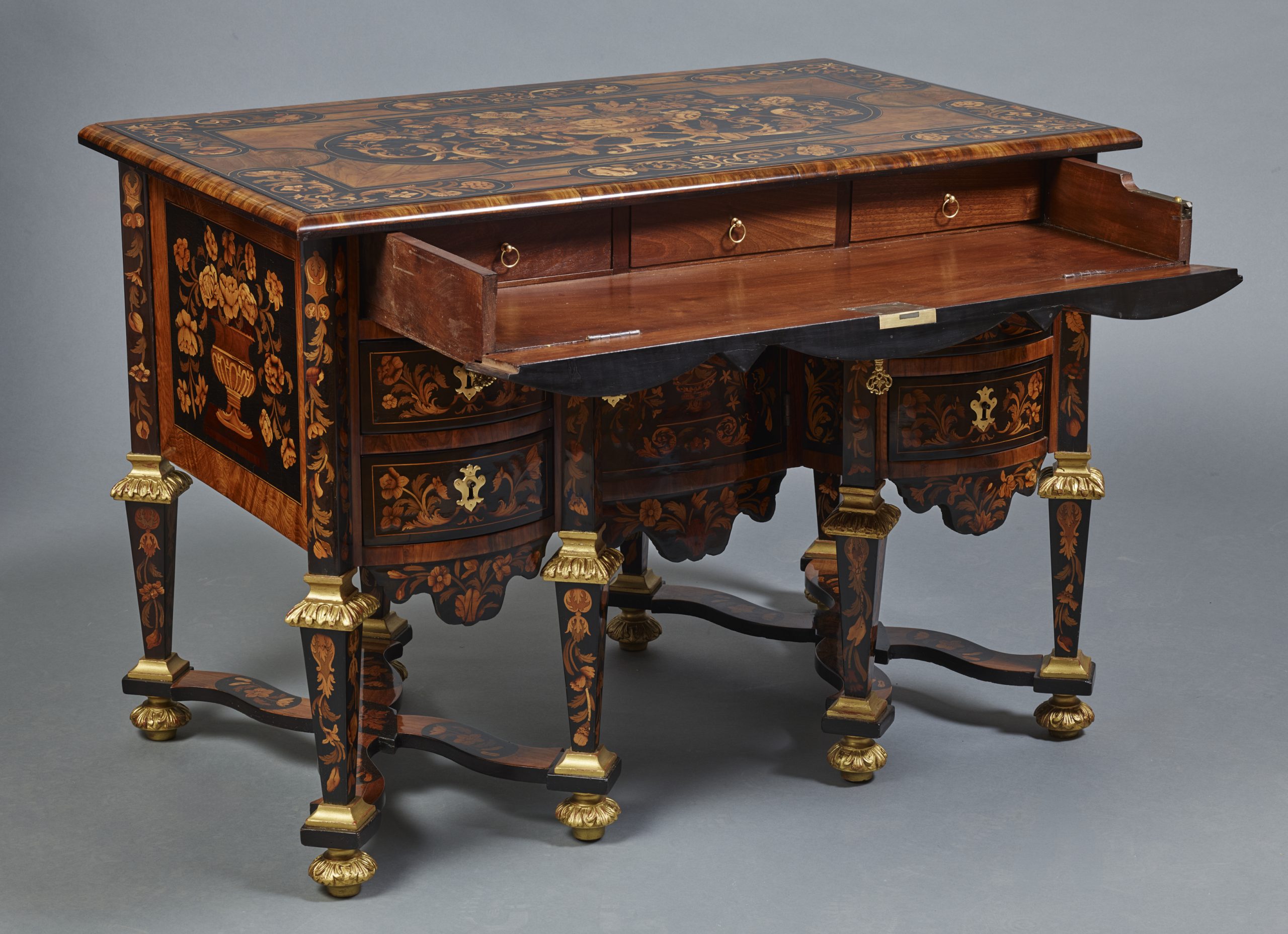 Bureau « Mazarin » richement marqueté en bois teinté et ébène sur fond d’olivier, ouvrant par quatre tiroirs, une porte centrale en retrait et un tiroir supérieur coulissant formant écritoire et découvrant un intérieur compartimenté de trois petits tiroirs.