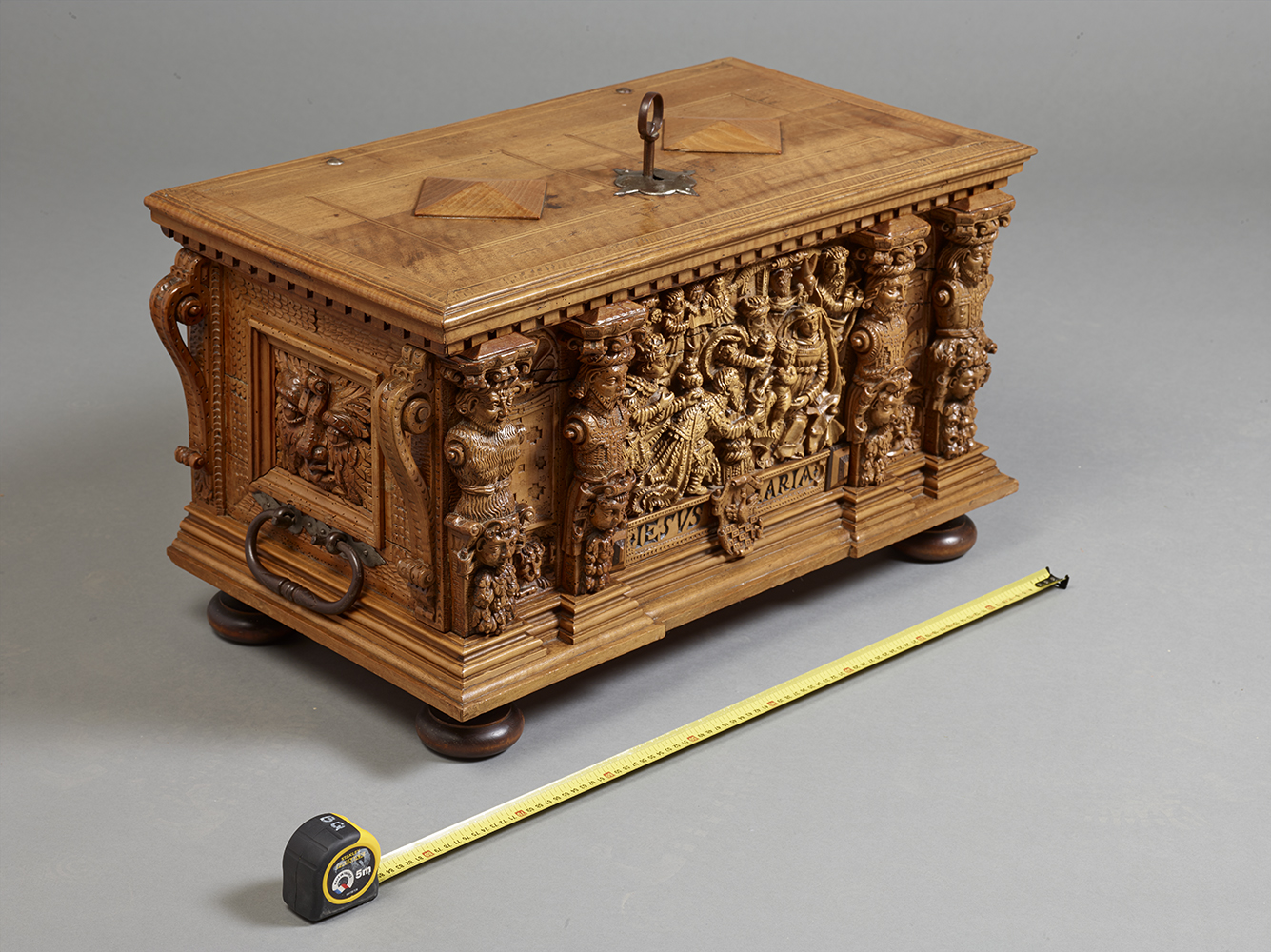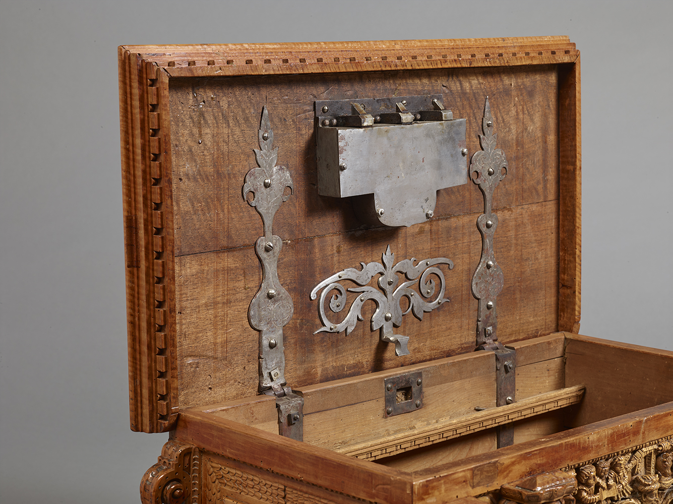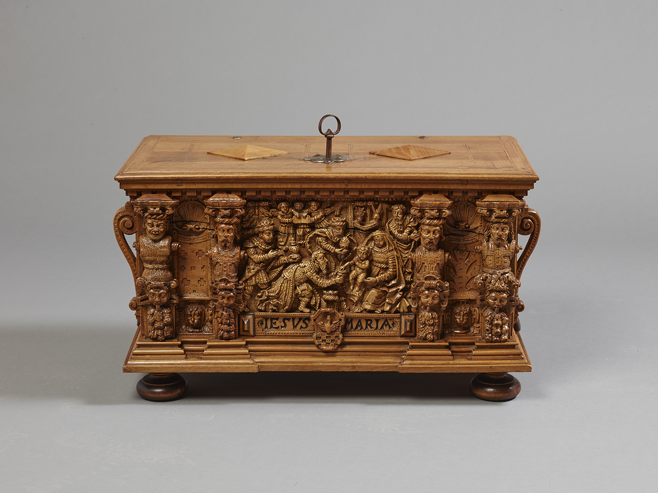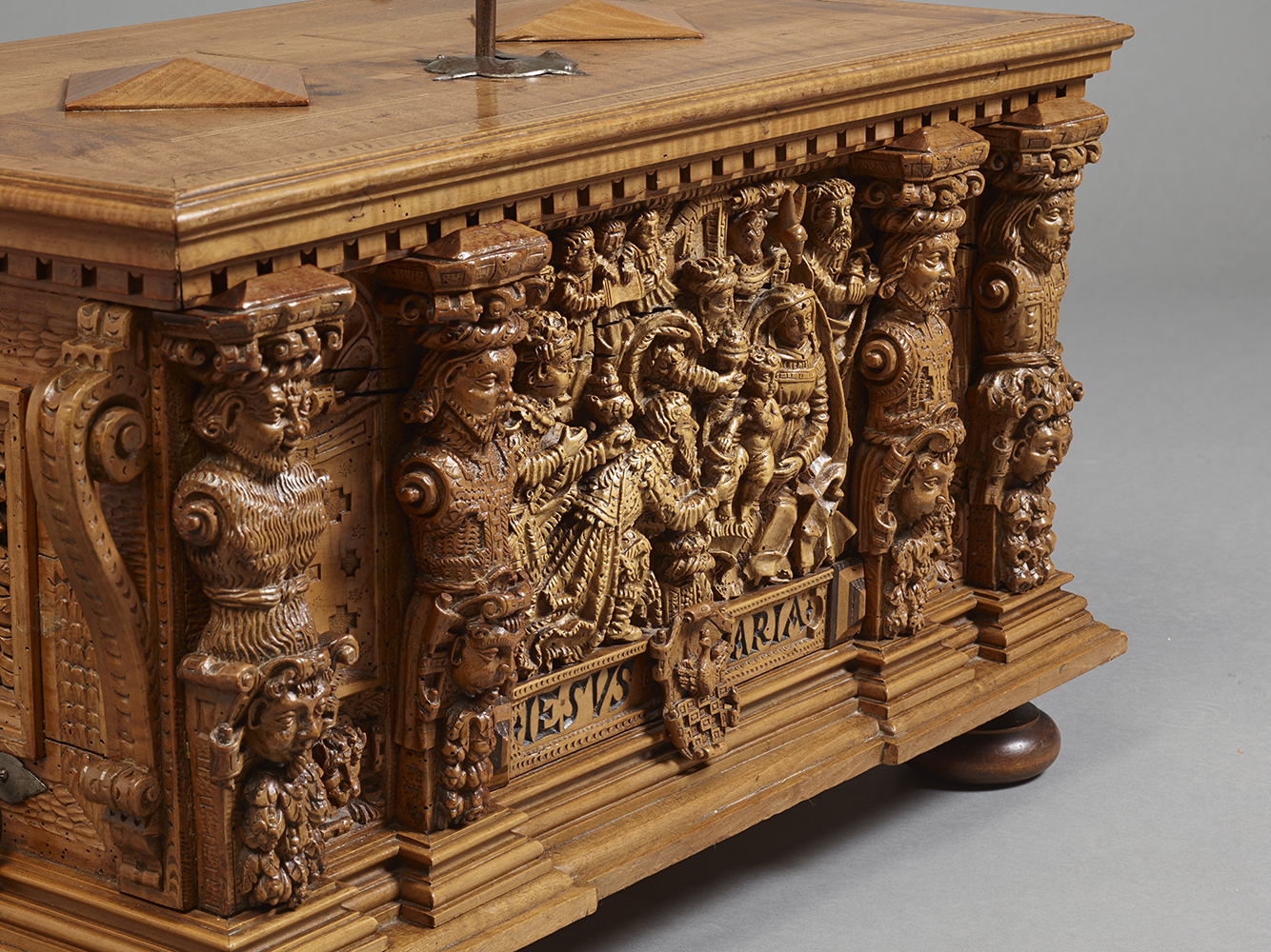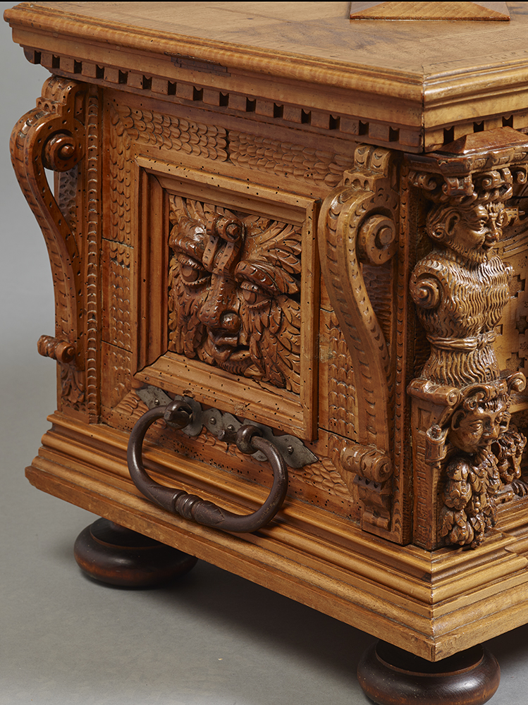 Si les termes en façade ont des visages expressifs, les côtés du coffre sont décorés de panneaux moulurés et sculptés de mascarons grotesques, caractéristiques du vocabulaire ornemental maniériste germanique de la fin du XVIe Siècle.