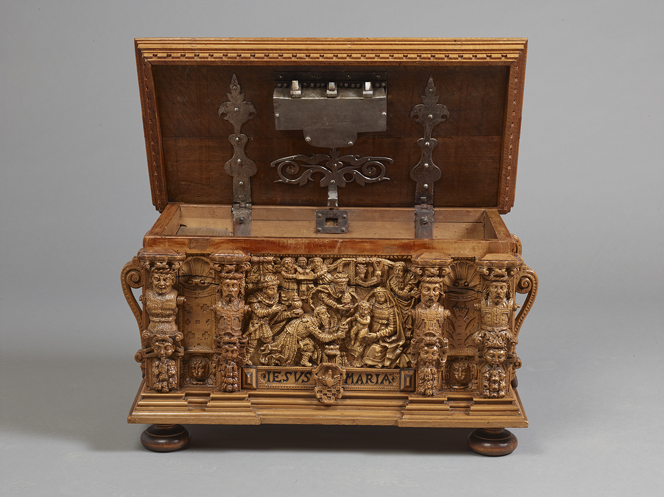 Coffre de Mariage en noyer richement sculpté en fort relief représentant l’Adoration de l’enfant Jésus aux Rois Mages.