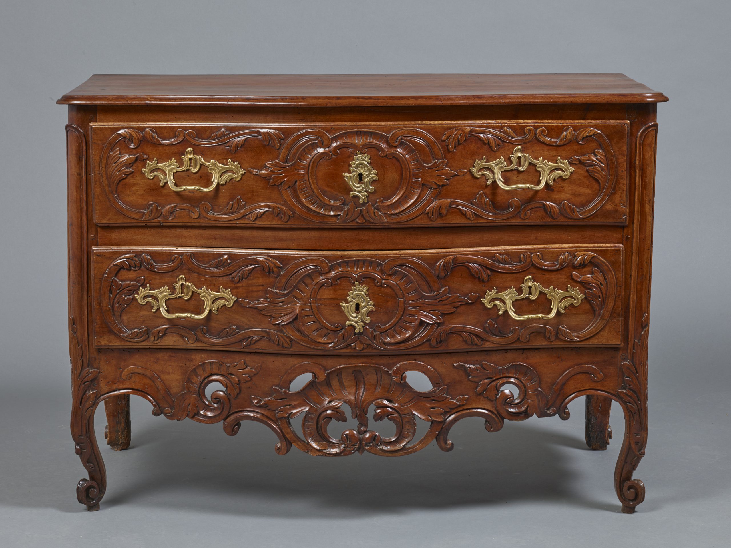 Commode galbée en noyer mouluré et sculpté de coquilles et feuilles d’acanthe, traverse richement sculptée et ajourée, ouvrant par deux tiroirs, Provence, époque Louis XV