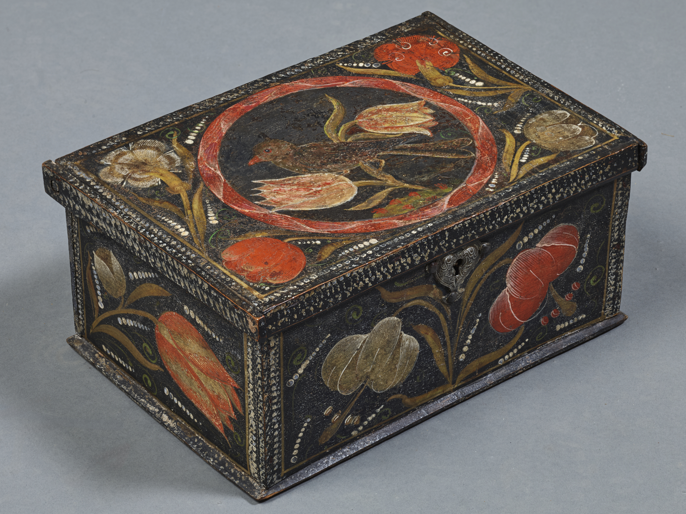 Petit coffre « de courtoisie » en bois peint de motifs floraux et d’un oiseau, Alsace, époque fin XVIIe