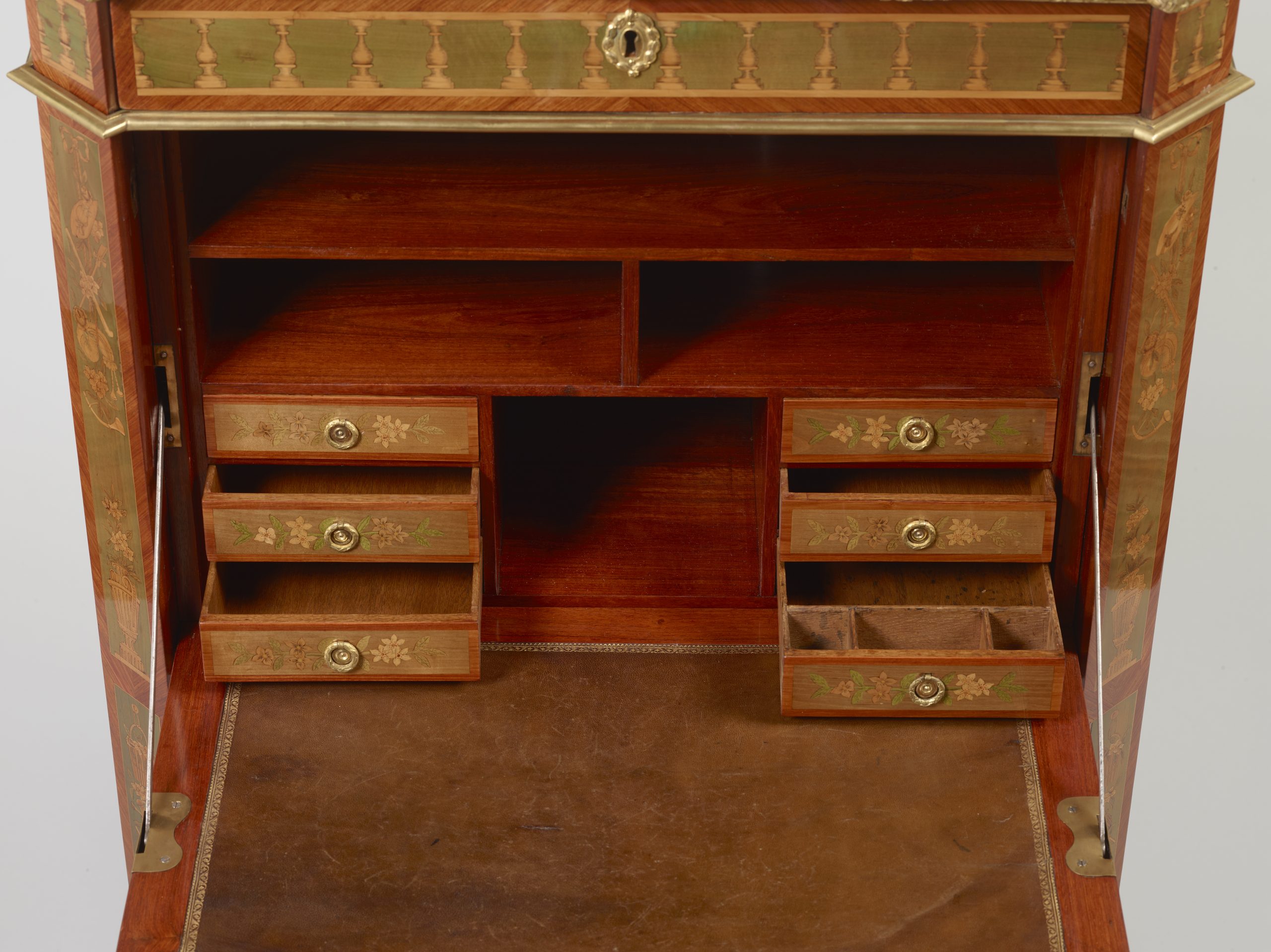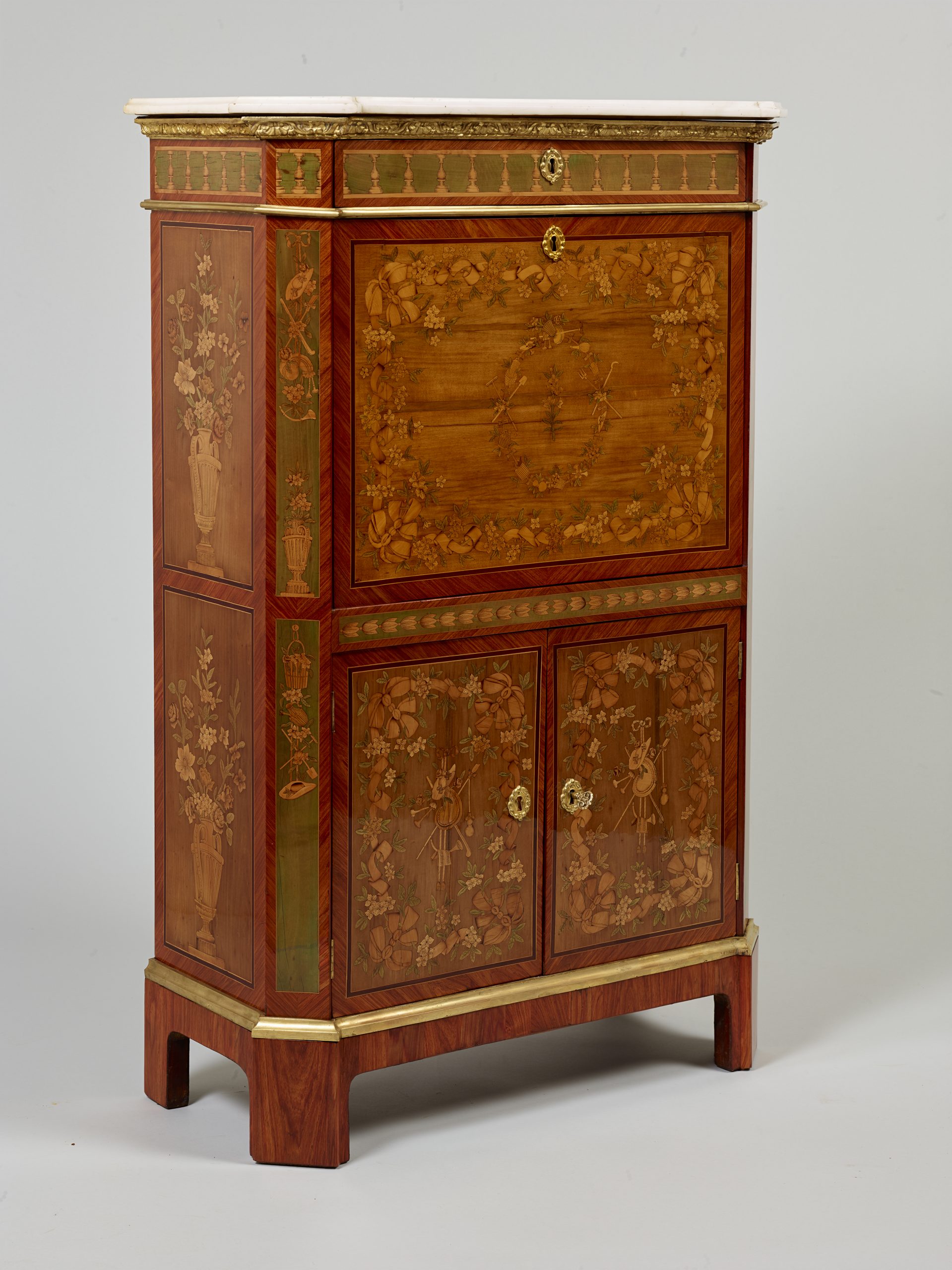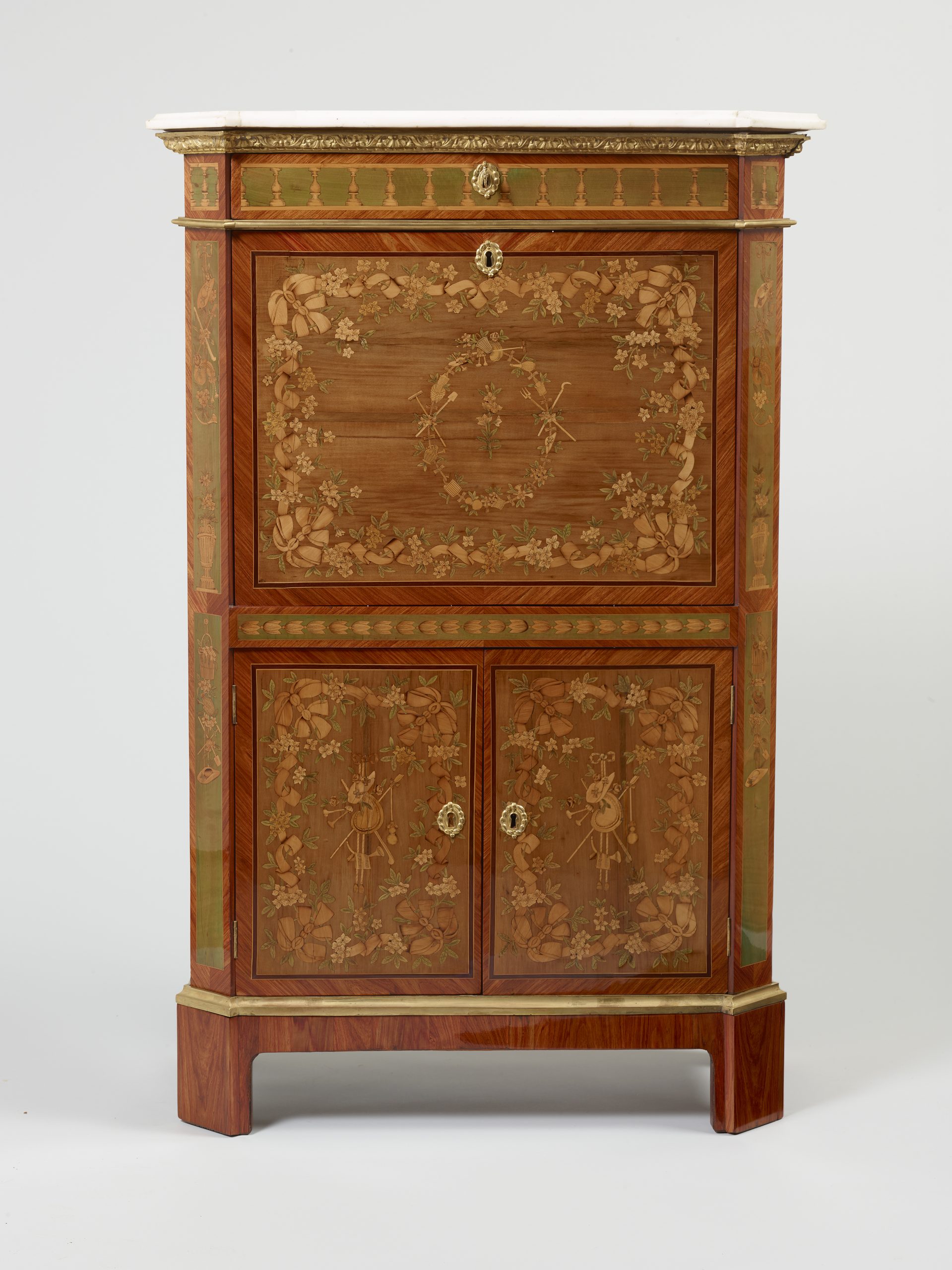 Petit secrétaire de Dame à pans coupés, orné d’une riche marqueterie de fleurs et rubans, aux attributs du Jardinage, sur fond de sycomore, dans des encadrements de bois de rose et filets d’amarante, ouvrant par un tiroir, un abattant et deux portes, le tiroir marqueté d’une balustrade sur fond de bois teinté vert, discrète ornementation de bronzes ciselés et dorés, dessus de marbre blanc de Carrare, estampillé Evald (Maitre en 1765), époque Louis XVI