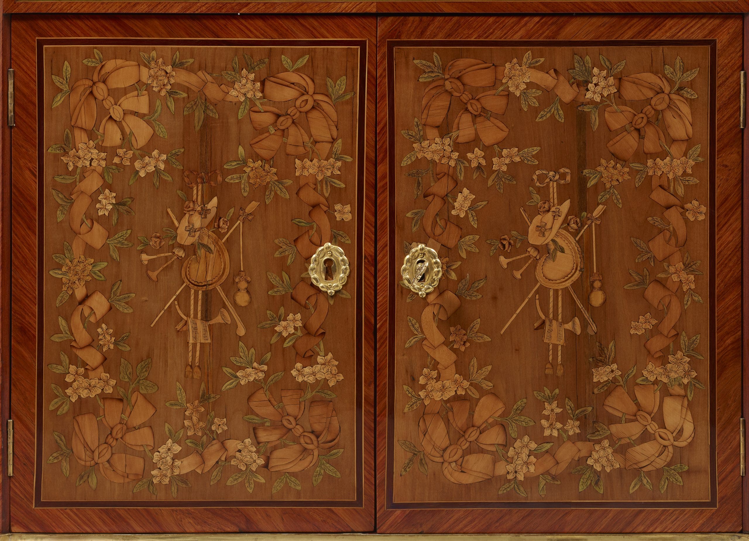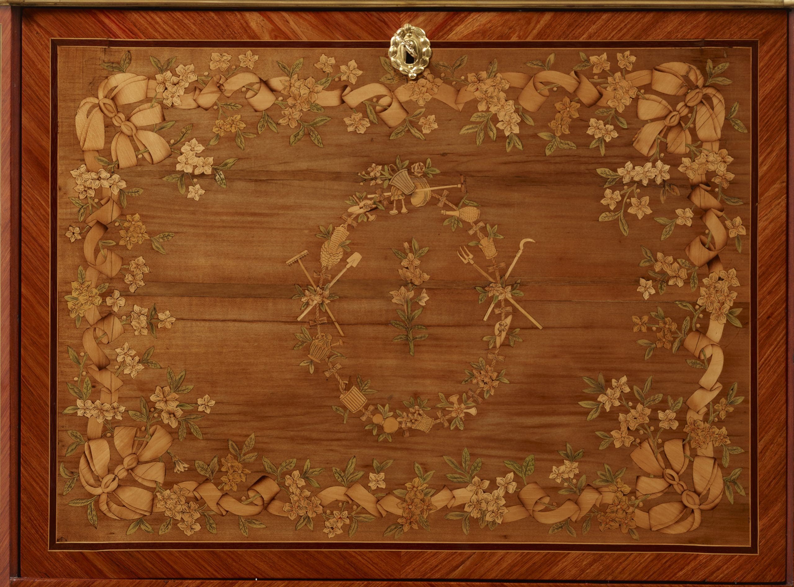 La décoration de ce meuble très originale et très inspirée de botanique laisse penser que l’artiste a été influencé voire dirigé par le goût pour la nature que la Reine Marie Antoinette a imposée au Petit Trianon à Versailles.