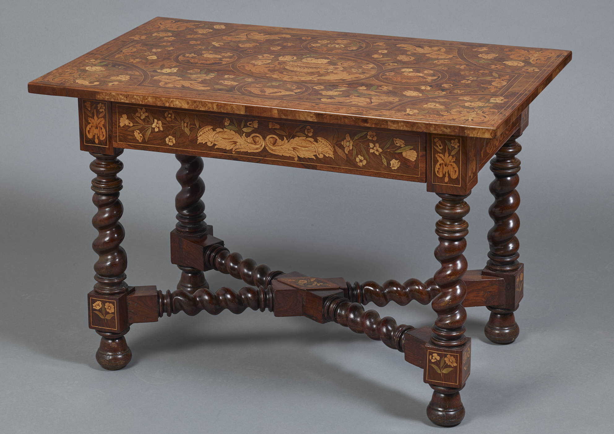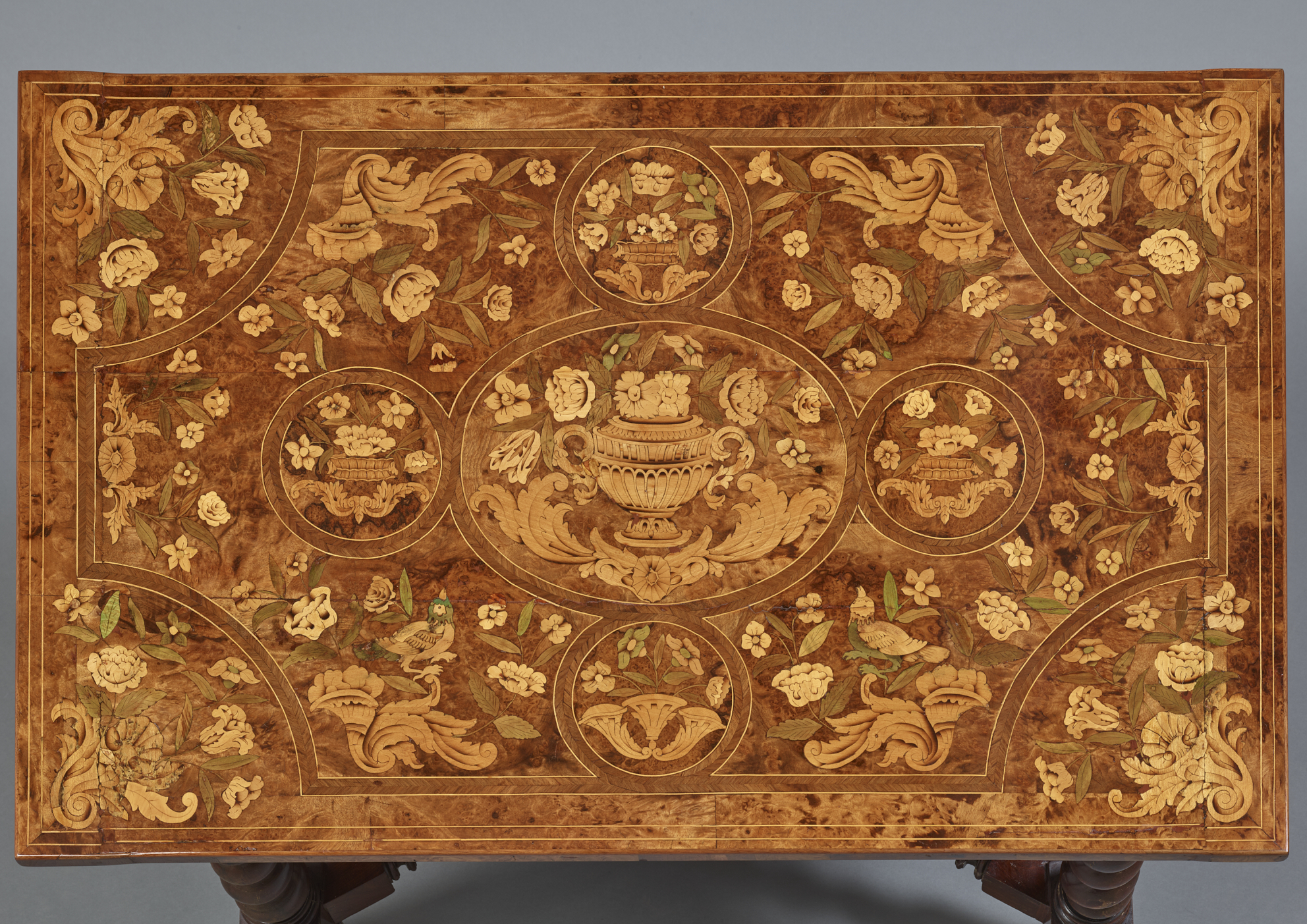 Le plateau présente un décor de marqueterie sur fond de loupe de tuya composé d’un médaillon central orné d’un vase fleuri, encadré de réserves circulaires et de rinceaux feuillagés.